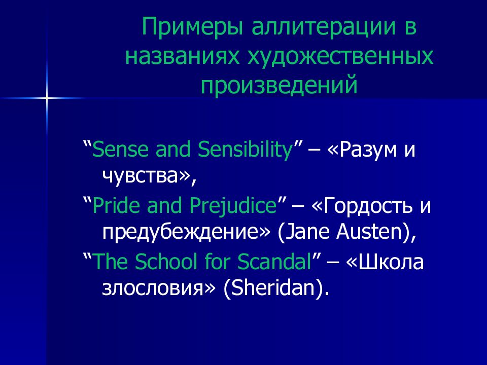 “ Sense and Sensibility ” – «Разум и чувства», “ Pride and Prejudice ” – «Гордость и предубеждение» (Jane Austen), “ The School for Scandal ” – «Школа злословия» (Sheridan).