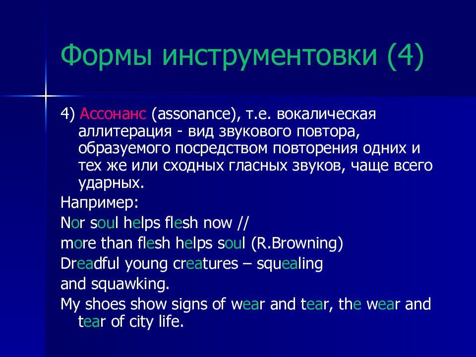 4) Ассонанс (assonance), т.е. вокалическая аллитерация - вид звукового повтора, образуемого посредством повторения одних и тех же или сходных гласных звуков, чаще всего ударных. Например: N o r s ou l h e lps fl e sh now // m o re than fl e sh h e lps s ou l (R.Browning) Dr ea dful young cr ea tures – squ ea ling and squawking. My shoes show signs of w ea r and t ea r, th e w ea r and t ea r of city life.