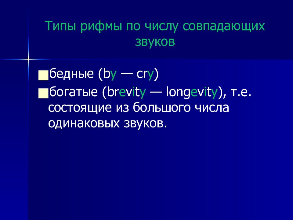 бедные (b y — cr y ) богатые (br e v i t y — long e v i t y ), т.е. состоящие из большого числа одинаковых звуков.