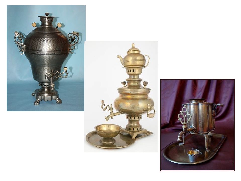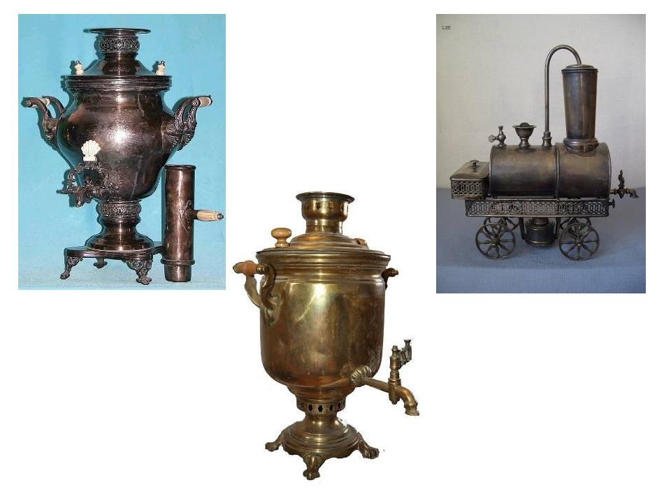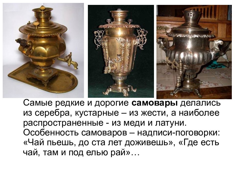Самые редкие и дорогие самовары делались из серебра, кустарные – из жести, а наиболее распространенные - из меди и латуни. Особенность самоваров – надписи-поговорки: «Чай пьешь, до ста лет доживешь», «Где есть чай, там и под елью рай»…