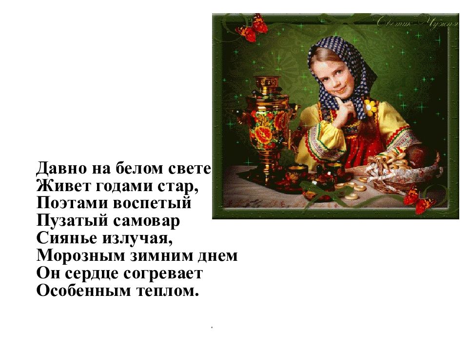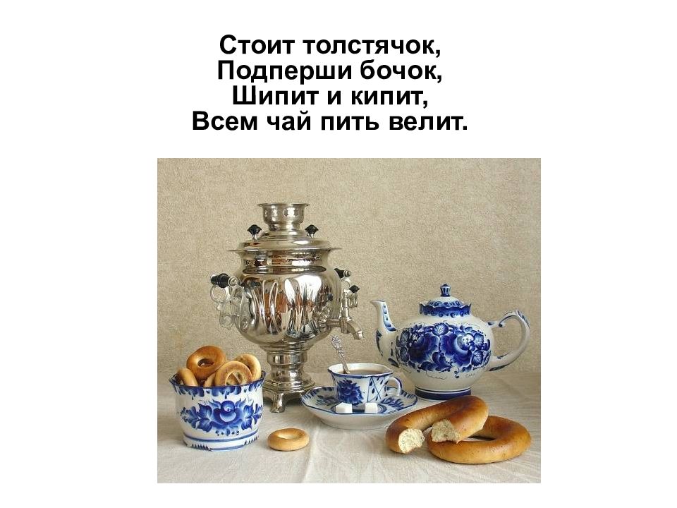 Стоит толстячок, Подперши бочок, Шипит и кипит, Всем чай пить велит.