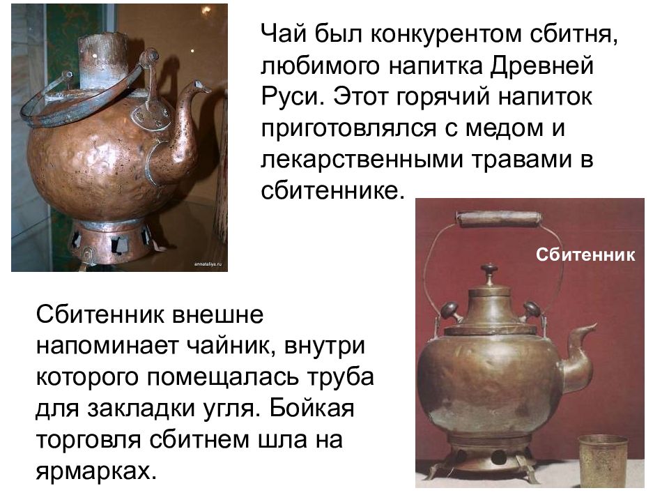 Чай был конкурентом сбитня, любимого напитка Древней Руси. Этот горячий напиток приготовлялся с медом и лекарственными травами в сбитеннике. Сбитенник внешне напоминает чайник, внутри которого помещалась труба для закладки угля. Бойкая торговля сбитнем шла на ярмарках. Сбитенник