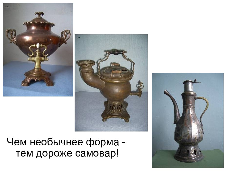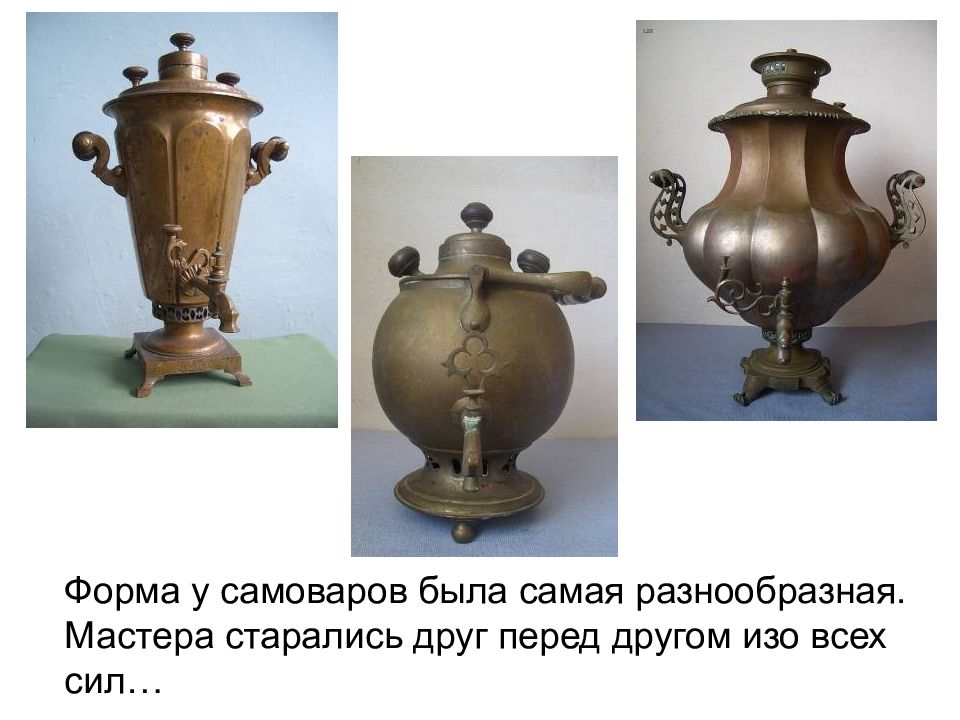 Форма у самоваров была самая разнообразная. Мастера старались друг перед другом изо всех сил…