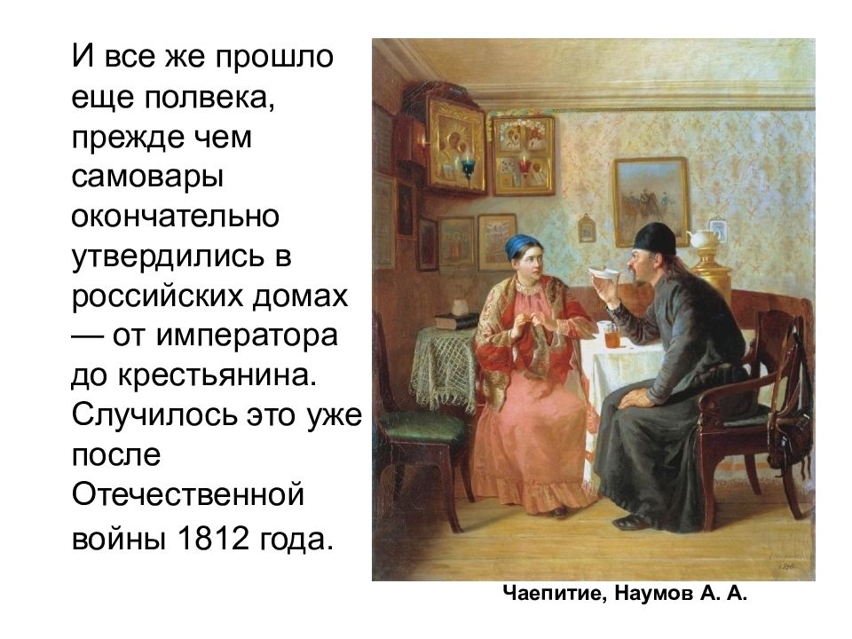 И все же прошло еще полвека, прежде чем самовары окончательно утвердились в российских домах — от императора до крестьянина. Случилось это уже после Отечественной войны 1812 года. Чаепитие, Наумов А. А.