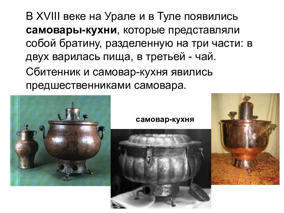 В XVIII веке на Урале и в Туле появились самовары-кухни, которые представляли собой братину, разделенную на три части: в двух варилась пища, в третьей - чай. Сбитенник и самовар-кухня явились предшественниками самовара. самовар-кухня