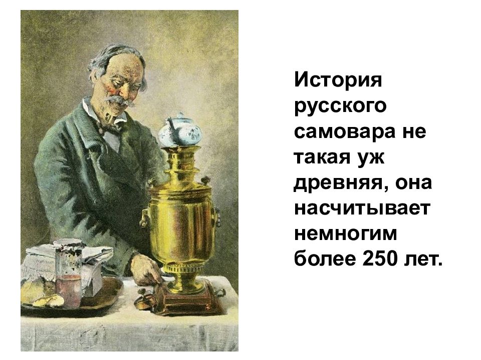 История русского самовара не такая уж древняя, она насчитывает немногим более 250 лет.