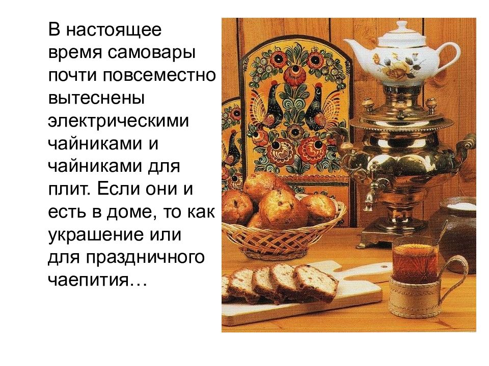 В настоящее время самовары почти повсеместно вытеснены электрическими чайниками и чайниками для плит. Если они и есть в доме, то как украшение или для праздничного чаепития…