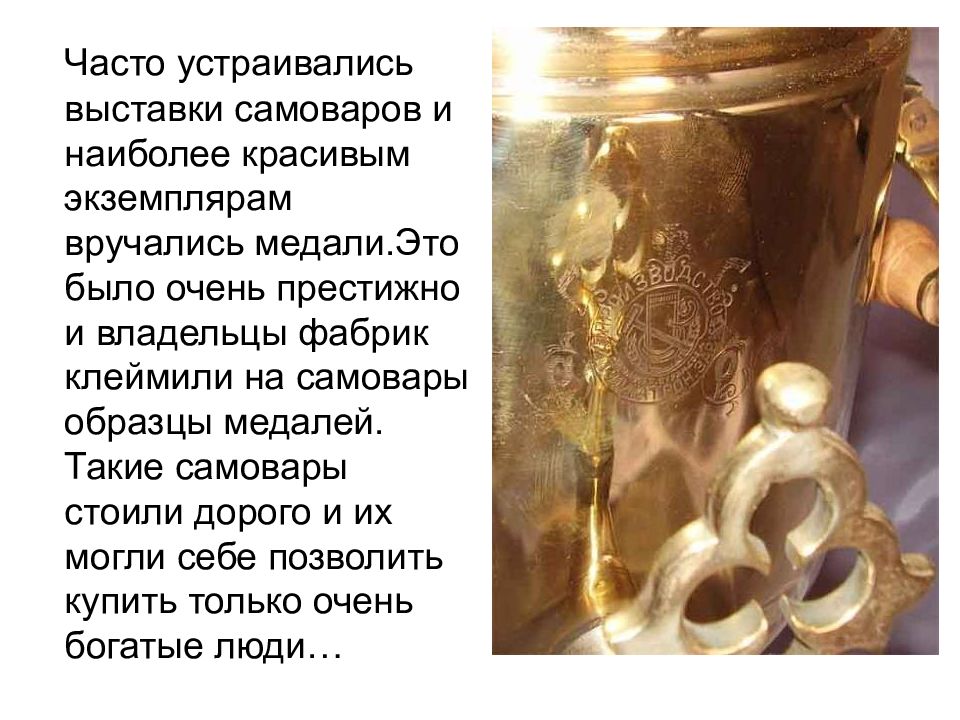 Часто устраивались выставки самоваров и наиболее красивым экземплярам вручались медали.Это было очень престижно и владельцы фабрик клеймили на самовары образцы медалей. Такие самовары стоили дорого и их могли себе позволить купить только очень богатые люди…