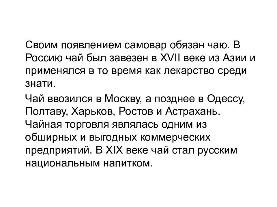 Своим появлением самовар обязан чаю. В Россию чай был завезен в XVII веке из Азии и применялся в то время как лекарство среди знати. Чай ввозился в Москву, а позднее в Одессу, Полтаву, Харьков, Ростов и Астрахань. Чайная торговля являлась одним из обширных и выгодных коммерческих предприятий. В XIX веке чай стал русским национальным напитком.