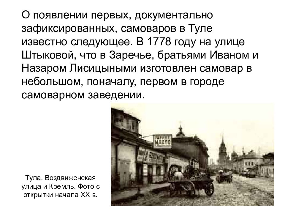 О появлении первых, документально зафиксированных, самоваров в Туле известно следующее. В 1778 году на улице Штыковой, что в Заречье, братьями Иваном и Назаром Лисицыными изготовлен самовар в небольшом, поначалу, первом в городе самоварном заведении.