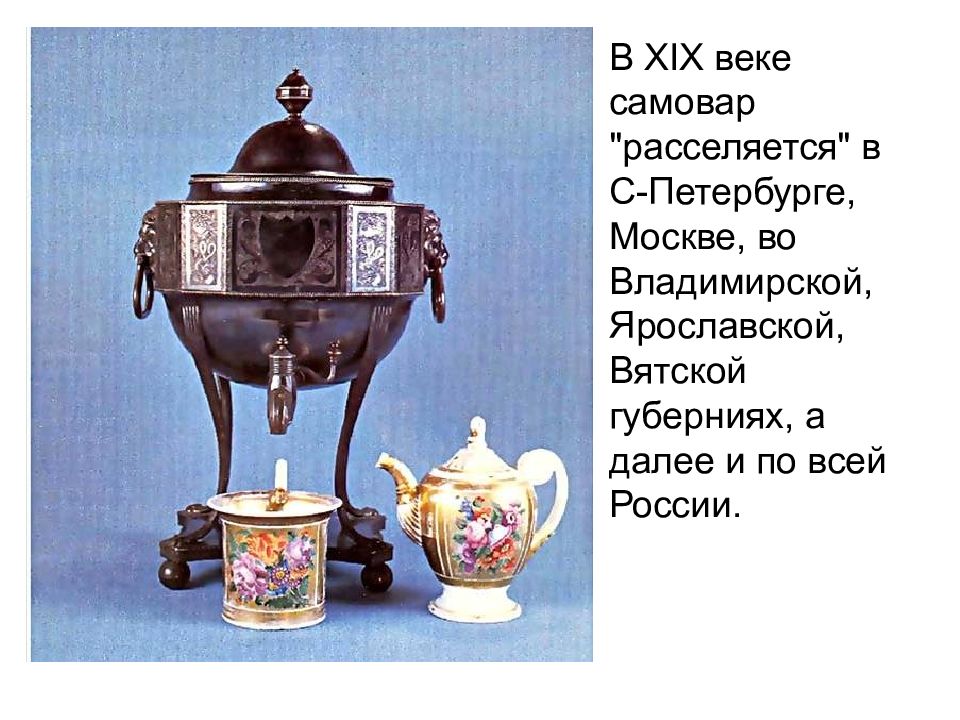 В XIX веке самовар "расселяется" в С-Петербурге, Москве, во Владимирской, Ярославской, Вятской губерниях, а далее и по всей России.