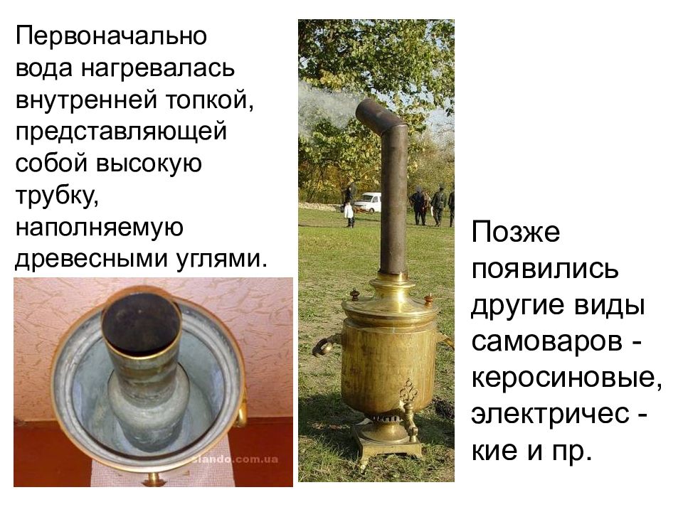 Позже появились другие виды самоваров -керосиновые, электричес -кие и пр. Первоначально вода нагревалась внутренней топкой, представляющей собой высокую трубку, наполняемую древесными углями.
