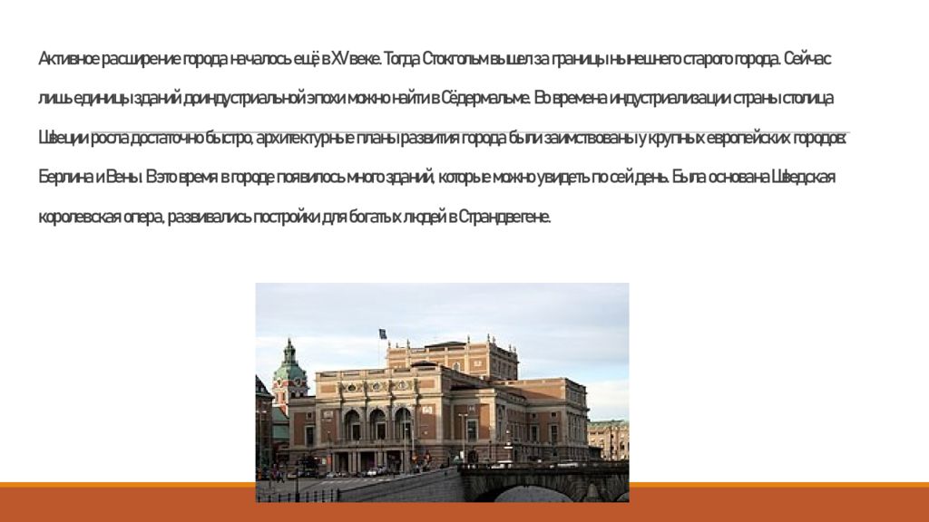 Активное расширение города началось ещё в XV веке. Тогда Стокгольм вышел за границы нынешнего старого города. Сейчас лишь единицы зданий доиндустриальной эпохи можно найти в Сёдермальме. Во времена индустриализации страны столица Швеции росла достаточно быстро, архитектурные планы развития города были заимствованы у крупных европейских городов: Берлина и Вены. В это время в городе появилось много зданий, которые можно увидеть по сей день. Была основана Шведская королевская опера, развивались постройки для богатых людей в Страндвегене.
