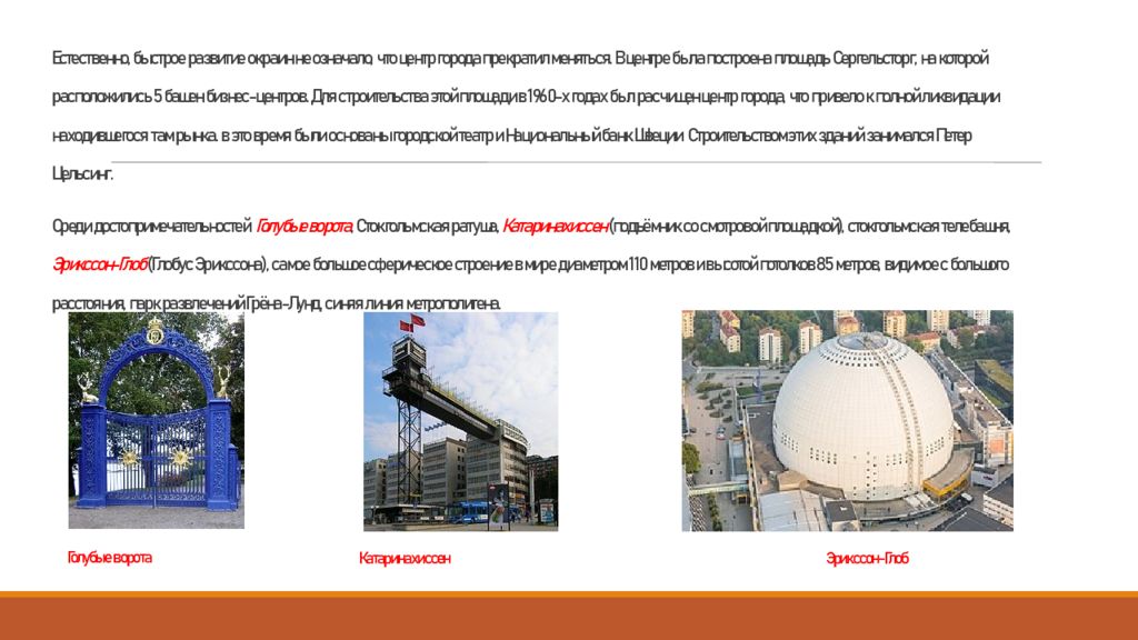 Естественно, быстрое развитие окраин не означало, что центр города прекратил меняться. В центре была построена площадь Сергельсторг, на которой расположились 5 башен бизнес-центров. Для строительства этой площади в 1960-х годах был расчищен центр города, что привело к полной ликвидации находившегося там рынка. в это время были основаны городской театр и Национальный банк Швеции. Строительством этих зданий занимался Петер Цельсинг. Среди достопримечательностей: Голубые ворота, Стокгольмская ратуша, Катаринахиссен (подъёмник со смотровой площадкой), стокгольмская телебашня, Эрикссон-Глоб (Глобус Эрикссона ), самое большое сферическое строение в мире диаметром 110 метров и высотой потолков 85 метров, видимое с большого расстояния, парк развлечений Грёна-Лунд. синяя линия метрополитена. Голубые ворота Катаринахиссен Эрикссон-Глоб