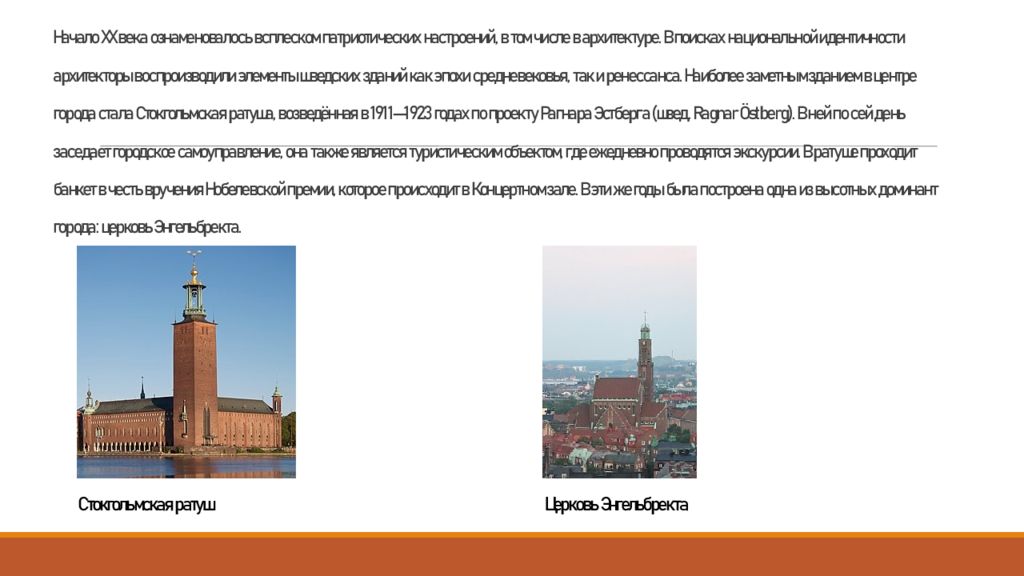 Начало XX века ознаменовалось всплеском патриотических настроений, в том числе в архитектуре. В поисках национальной идентичности архитекторы воспроизводили элементы шведских зданий как эпохи средневековья, так и ренессанса. Наиболее заметным зданием в центре города стала Стокгольмская ратуша, возведённая в 1911—1923 годах по проекту Рагнара Эстберга (швед. Ragnar Östberg ). В ней по сей день заседает городское самоуправление, она также является туристическим объектом, где ежедневно проводятся экскурсии. В ратуше проходит банкет в честь вручения Нобелевской премии, которое происходит в Концертном зале. В эти же годы была построена одна из высотных доминант города: церковь Энгельбректа. Стокгольмская ратуш Церковь Энгельбректа