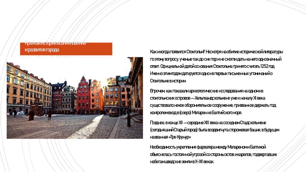 Как и когда появился Стокгольм? Несмотря на обилие исторической литературы по этому вопросу, ученые так до сих пор и не смогли дать на него однозначный ответ. Официальной датой основания Стокгольма принято считать 1252 год. Именно этим годом датируется одно из первых письменных упоминаний о Стокгольме в истории. Впрочем, как показали археологические исследования на одном из стокгольмских островов — Хельгеандсхольмене уже к началу XI века существовало некое оборонительное сооружение, призванное держать под контролем вход в (озеро) Меларен из Балтийского моря. Позднее, в конце XII — середине XIII века на соседнем Стадсхольмене (сегодняшний Старый город) была воздвигнута сторожевая башня, в будущем названная « Тре Крунур » Необходимость укрепления фарватера между Мелареном и Балтикой объяснялась постоянной угрозой со стороны эстов и карелов, подвергавших набегам шведские земли в Х-ХII веках. Краткая история возникновения и развития города