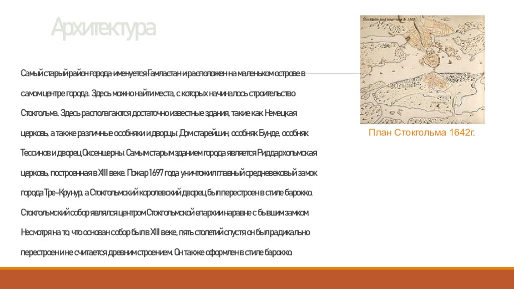 Самый старый район города именуется Гамластан и расположен на маленьком острове в самом центре города. Здесь можно найти места, с которых начиналось строительство Стокгольма. Здесь располагаются достаточно известные здания, такие как Немецкая церковь, а также различные особняки и дворцы: Дом старейшин, особняк Бунде, особняк Тессинов и дворец Оксеншерны. Самым старым зданием города является Риддархольмская церковь, построенная в XIII веке. Пожар 1697 года уничтожил главный средневековый замок города Тре-Крунур, а Стокгольмский королевский дворец был перестроен в стиле барокко. Стокгольмский собор являлся центром Стокгольмской епархии наравне с бывшим замком. Несмотря на то, что основан собор был в XIII веке, пять столетий спустя он был радикально перестроен и не считается древним строением. Он также оформлен в стиле барокко. План Стокгольма 1642г.