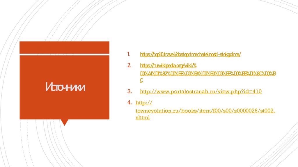 https ://top10.travel/dostoprimechatelnosti-stokgolma / https://ru.wikipedia.org/wiki/% D0%A1%D1%82%D0%BE%D0%BA%D0%B3%D0%BE%D0%BB%D1%8C%D0%BC http:// www.portalostranah.ru/view.php?id=410 http:// townevolution.ru/books/item/f00/s00/z0000026/st002.shtml