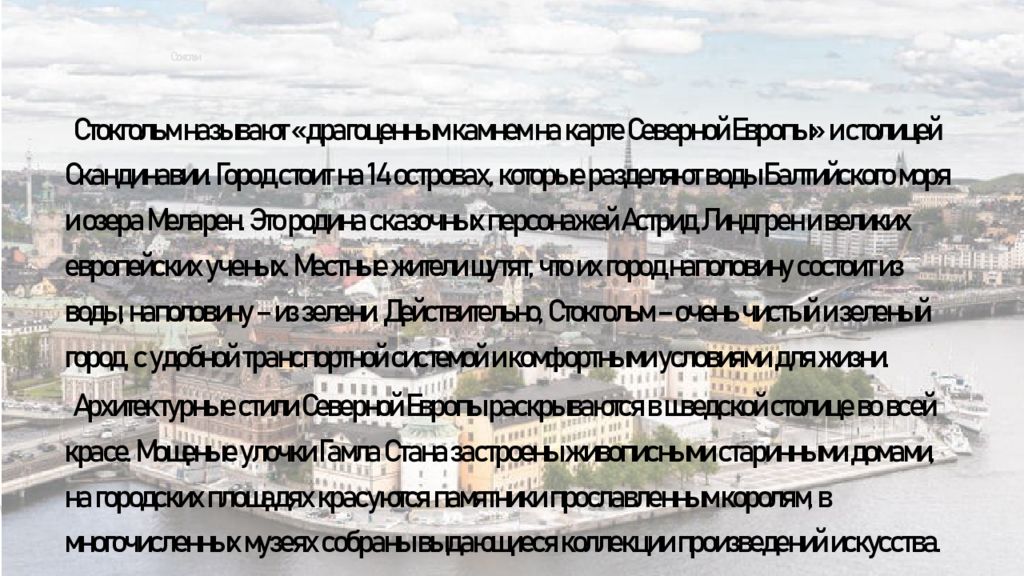 Стокгольм называют «драгоценным камнем на карте Северной Европы» и столицей Скандинавии. Город стоит на 14 островах, которые разделяют воды Балтийского моря и озера Меларен. Это родина сказочных персонажей Астрид Линдгрен и великих европейских ученых. Местные жители шутят, что их город наполовину состоит из воды, наполовину – из зелени. Действительно, Стокгольм – очень чистый и зеленый город, с удобной транспортной системой и комфортными условиями для жизни. Архитектурные стили Северной Европы раскрываются в шведской столице во всей красе. Мощеные улочки Гамла Стана застроены живописными старинными домами, на городских площадях красуются памятники прославленным королям, в многочисленных музеях собраны выдающиеся коллекции произведений искусства.