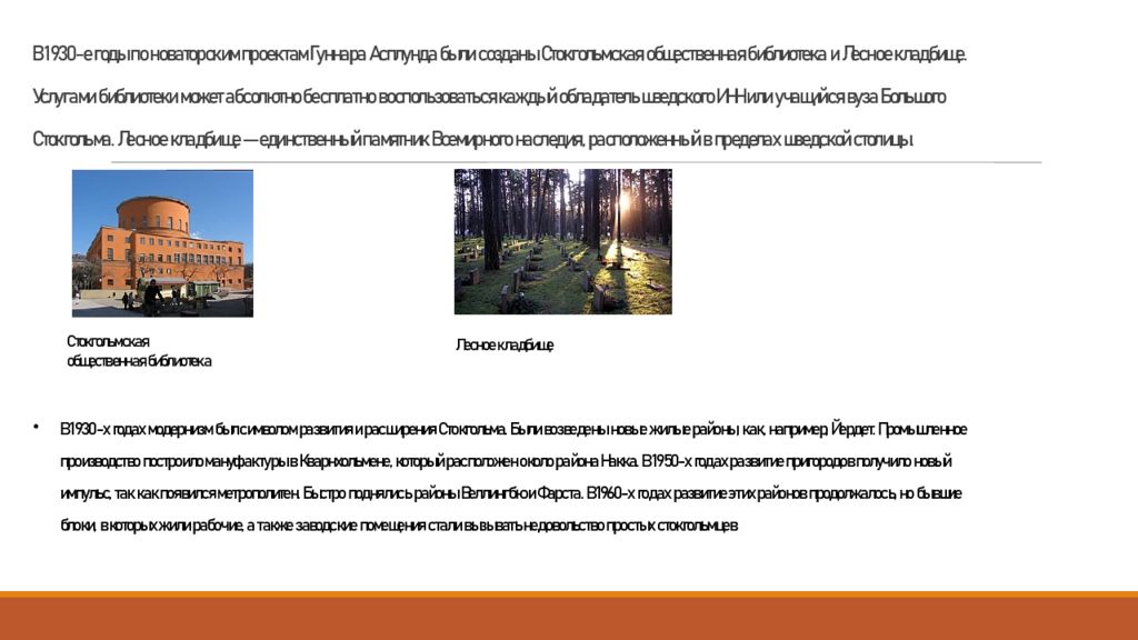 В 1930-е годы по новаторским проектам Гуннара Асплунда были созданы Стокгольмская общественная библиотека и Лесное кладбище. Услугами библиотеки может абсолютно бесплатно воспользоваться каждый обладатель шведского ИНН или учащийся вуза Большого Стокгольма. Лесное кладбище — единственный памятник Всемирного наследия, расположенный в пределах шведской столицы. В 1930-х годах модернизм был символом развития и расширения Стокгольма. Были возведены новые жилые районы, как, например, Йердет. Промышленное производство построило мануфактуры в Кварнхольмене, который расположен около района Накка. В 1950-х годах развитие пригородов получило новый импульс, так как появился метрополитен. Быстро поднялись районы Веллингбю и Фарста. В 1960-х годах развитие этих районов продолжалось, но бывшие блоки, в которых жили рабочие, а также заводские помещения стали вызывать недовольство простых стокгольмцев Стокгольмская общественная библиотека Лесное кладбище