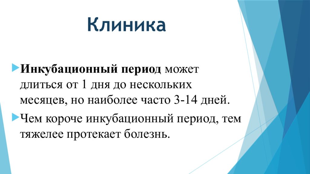 Инкубационный период может длиться от 1 дня до нескольких месяцев, но наиболее часто 3-14 дней. Чем короче инкубационный период, тем тяжелее протекает болезнь.