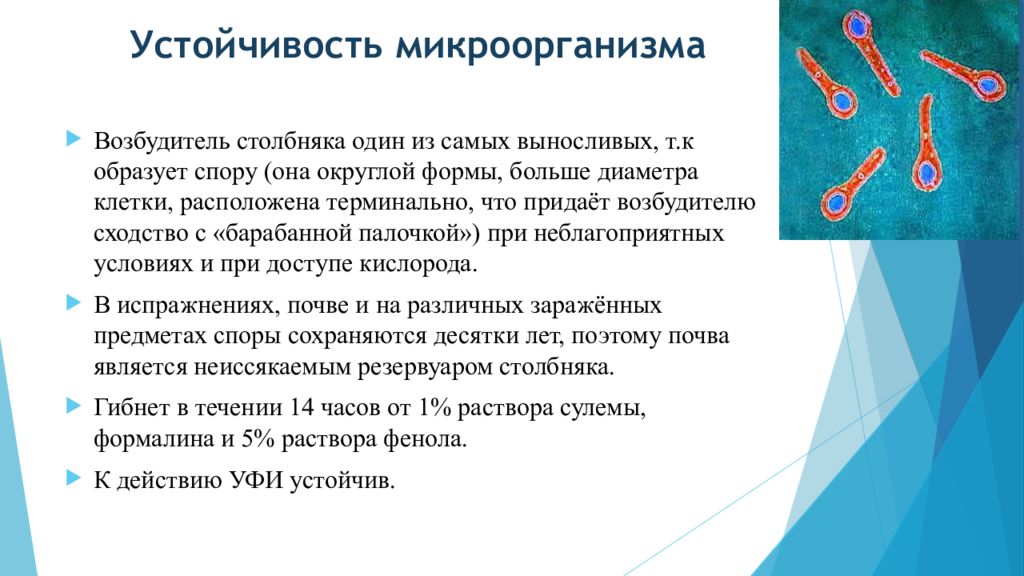 Возбудитель столбняка один из самых выносливых, т.к образует спору (она округлой формы, больше диаметра клетки, расположена терминально, что придаёт возбудителю сходство с «барабанной палочкой») при неблагоприятных условиях и при доступе кислорода. В испражнениях, почве и на различных заражённых предметах споры сохраняются десятки лет, поэтому почва является неиссякаемым резервуаром столбняка. Гибнет в течении 14 часов от 1% раствора сулемы, формалина и 5% раствора фенола. К действию УФИ устойчив.
