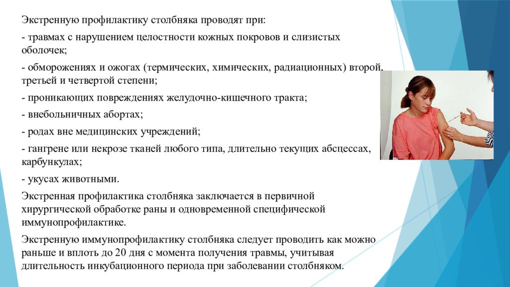 Экстренную профилактику столбняка проводят при: - травмах с нарушением целостности кожных покровов и слизистых оболочек; - обморожениях и ожогах (термических, химических, радиационных) второй, третьей и четвертой степени; - проникающих повреждениях желудочно-кишечного тракта; - внебольничных абортах; - родах вне медицинских учреждений; - гангрене или некрозе тканей любого типа, длительно текущих абсцессах, карбункулах; - укусах животными. Экстренная профилактика столбняка заключается в первичной хирургической обработке раны и одновременной специфической иммунопрофилактике. Экстренную иммунопрофилактику столбняка следует проводить как можно раньше и вплоть до 20 дня с момента получения травмы, учитывая длительность инкубационного периода при заболевании столбняком.