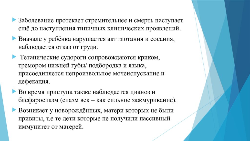 З аболевание протекает стремительнее и смерть наступает ещё до наступления типичных клинических проявлений. Вначале у ребёнка нарушается акт глотания и сосания, наблюдается отказ от груди. Тетанические судороги сопровождаются криком, тремором нижней губы/ подбородка и языка, присоединяется непроизвольное мочеиспускание и дефекация. Во время приступа также наблюдается цианоз и блефароспазм (спазм век – как сильное зажмуривание). Возникает у новорождённых, матери которых не были привиты, т.е те дети которые не получили пассивный иммунитет от матерей.