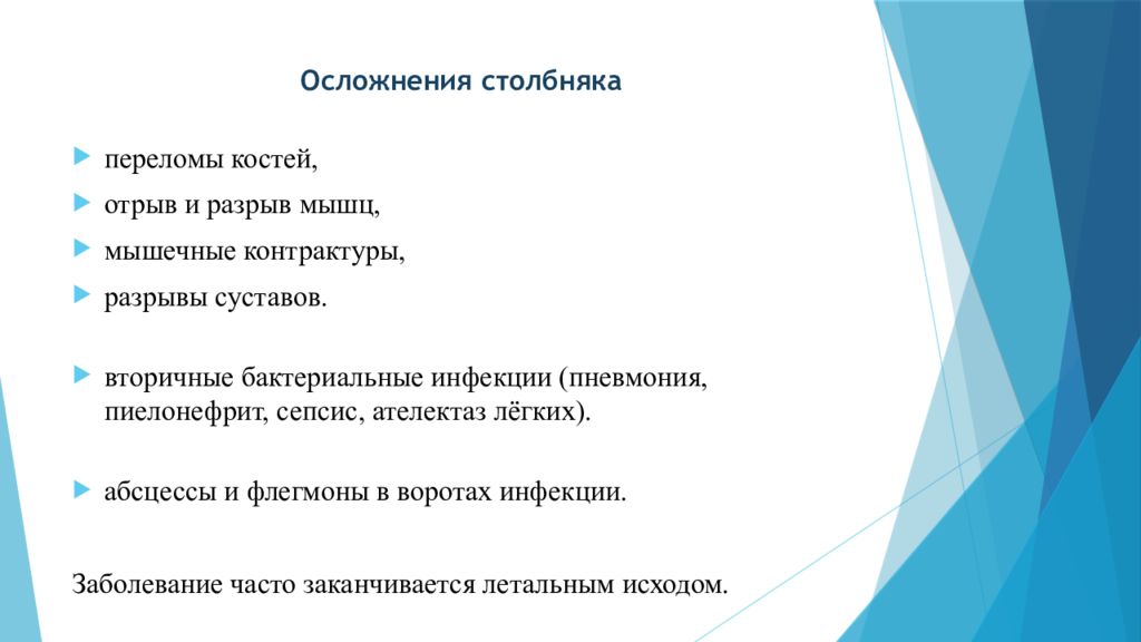 переломы костей, отрыв и разрыв мышц, мышечные контрактуры, разрывы суставов. вторичные бактериальные инфекции (пневмония, пиелонефрит, сепсис, ателектаз лёгких). абсцессы и флегмоны в воротах инфекции. Заболевание часто заканчивается летальным исходом.