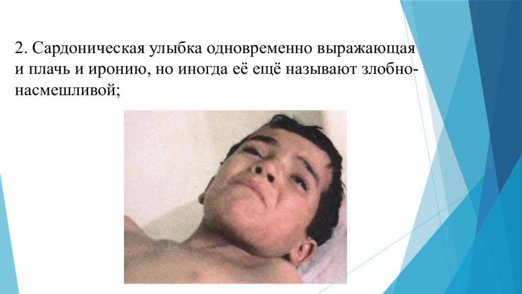 2. Сардоническая улыбка одновременно выражающая и плачь и иронию, но иногда её ещё называют злобно-насмешливой;