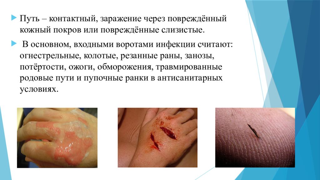 Путь – контактный, заражение через повреждённый кожный покров или повреждённые слизистые. В основном, входными воротами инфекции считают: огнестрельные, колотые, резанные раны, занозы, потёртости, ожоги, обморожения, травмированные родовые пути и пупочные ранки в антисанитарных условиях.
