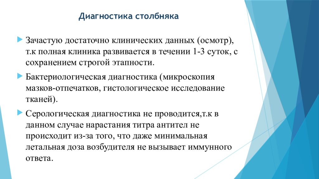 Зачастую достаточно клинических данных (осмотр), т.к полная клиника развивается в течении 1-3 суток, с сохранением строгой этапности. Бактериологическая диагностика (микроскопия мазков-отпечатков, гистологическое исследование тканей). Серологическая диагностика не проводится,т.к в данном случае нарастания титра антител не происходит из-за того, что даже минимальная летальная доза возбудителя не вызывает иммунного ответа.