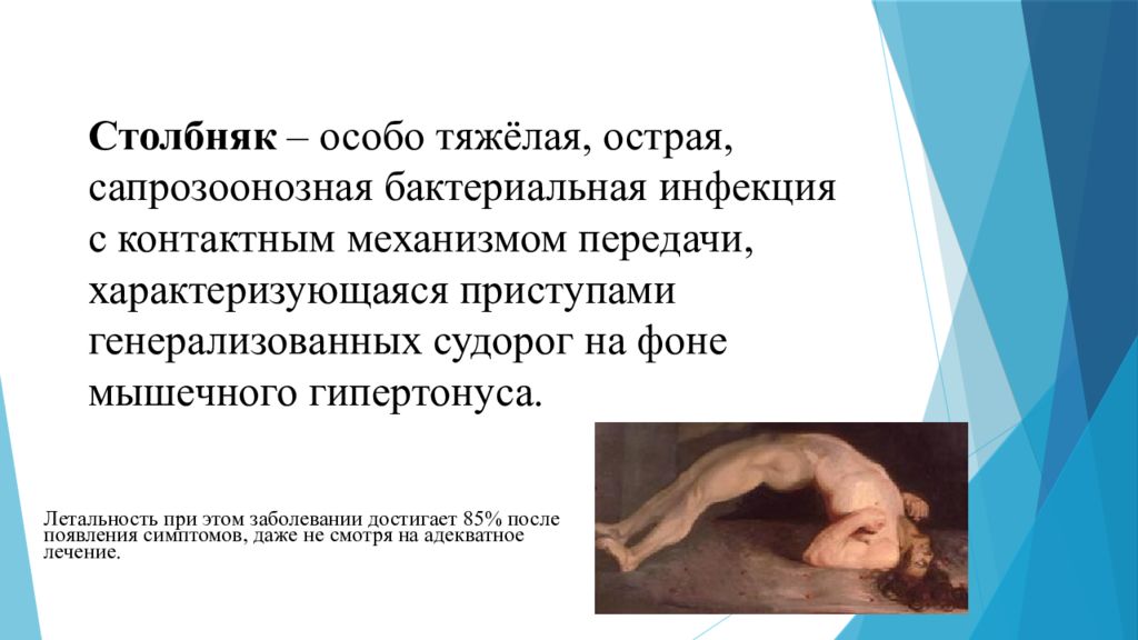 Столбняк – особо тяжёлая, острая, сапрозоонозная бактериальная инфекция с контактным механизмом передачи, характеризующаяся приступами генерализованных судорог на фоне мышечного гипертонуса. Летальность при этом заболевании достигает 85% после появления симптомов, даже не смотря на адекватное лечение.