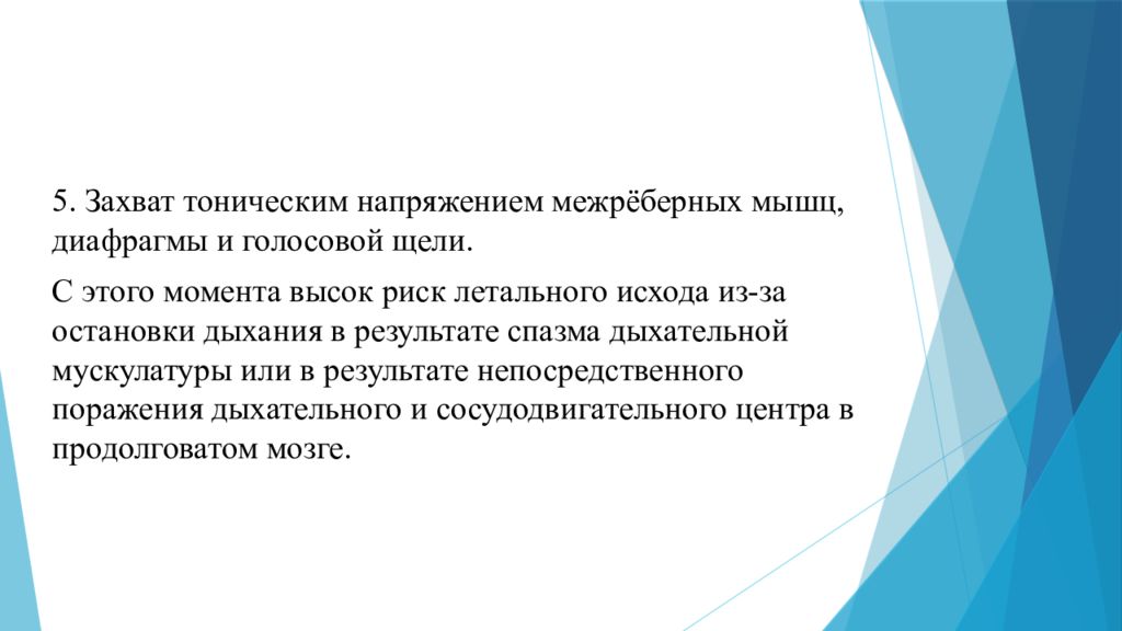 5. Захват тоническим напряжением межрёберных мышц, диафрагмы и голосовой щели. С этого момента высок риск летального исхода из-за остановки дыхания в результате спазма дыхательной мускулатуры или в результате непосредственного поражения дыхательного и сосудодвигательного центра в продолговатом мозге.