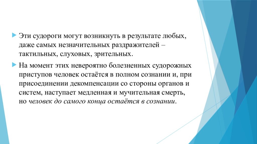 Эти судороги могут возникнуть в результате любых, даже самых незначительных раздражителей – тактильных, слуховых, зрительных. На момент этих невероятно болезненных судорожных приступов человек остаётся в полном сознании и, при присоединении декомпенсации со стороны органов и систем, наступает медленная и мучительная смерть, но человек до самого конца остаётся в сознании.