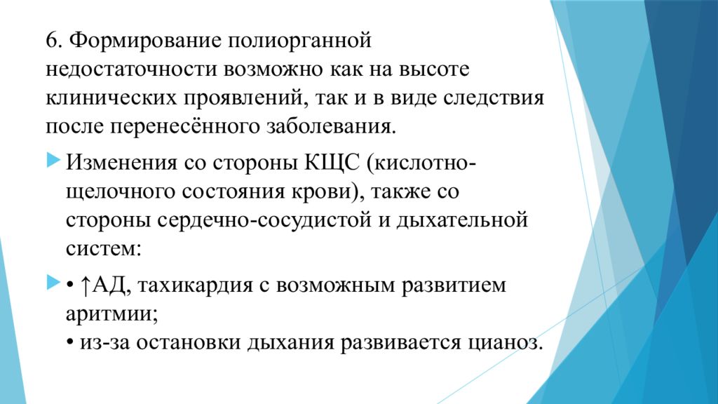 6. Формирование полиорганной недостаточности возможно как на высоте клинических проявлений, так и в виде следствия после перенесённого заболевания. Изменения со стороны КЩС (кислотно-щелочного состояния крови), также со стороны сердечно-сосудистой и дыхательной систем: • ↑АД, тахикардия с возможным развитием аритмии; • из-за остановки дыхания развивается цианоз.