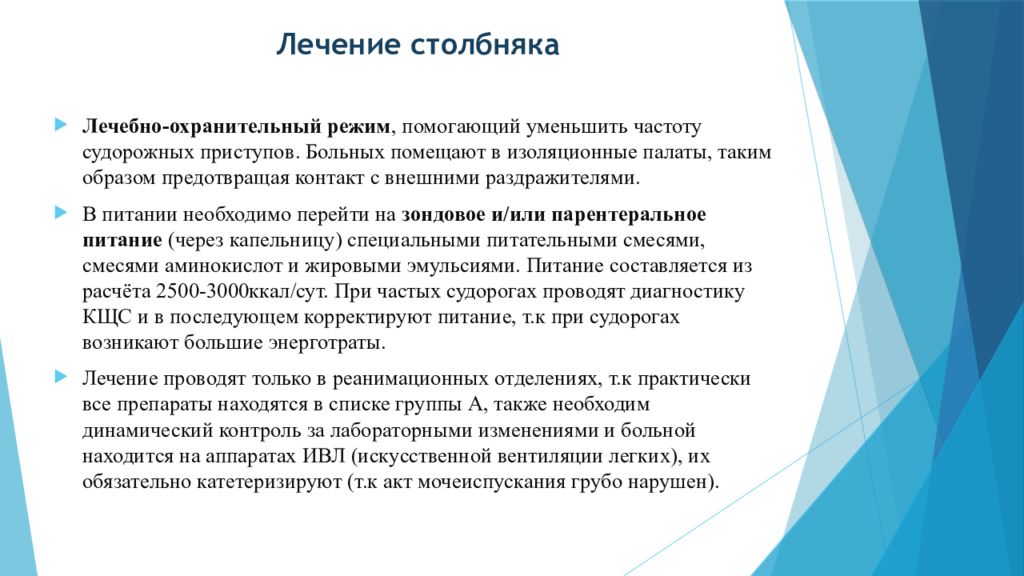 К этиотропным препаратам относят: противостолбнячный иммуноглобулин противостолбнячная очищенная концентрированная сыворотка. Их используют только при подозерении на заражение, пока симптомов еще не видно. Патогенетическая терапия: миорелаксанты, противосудорожные средства, наркотические анальгетики, антигистаминные препараты, барбитураты, β- адреноблокаторы для уменьшения влияния симпатической нервной системы. При длительном тяжёлом течении антибиотики для профилактики/лечения пневмонии и сепсиса.