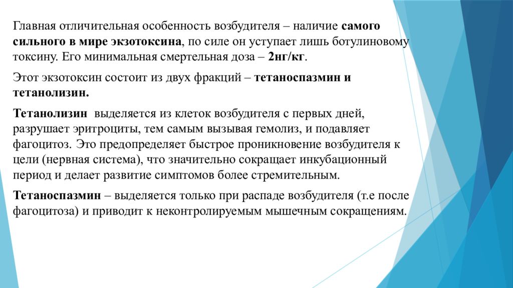 Главная отличительная особенность возбудителя – наличие самого сильного в мире экзотоксина, по силе он уступает лишь ботулиновому токсину. Его минимальная смертельная доза – 2нг/кг. Этот экзотоксин состоит из двух фракций – тетаноспазмин и тетанолизин. Тетанолизин выделяется из клеток возбудителя с первых дней, разрушает эритроциты, тем самым вызывая гемолиз, и подавляет фагоцитоз. Это предопределяет быстрое проникновение возбудителя к цели (нервная система), что значительно сокращает инкубационный период и делает развитие симптомов более стремительным. Тетаноспазмин – выделяется только при распаде возбудителя ( т.е после фагоцитоза) и приводит к неконтролируемым мышечным сокращениям.