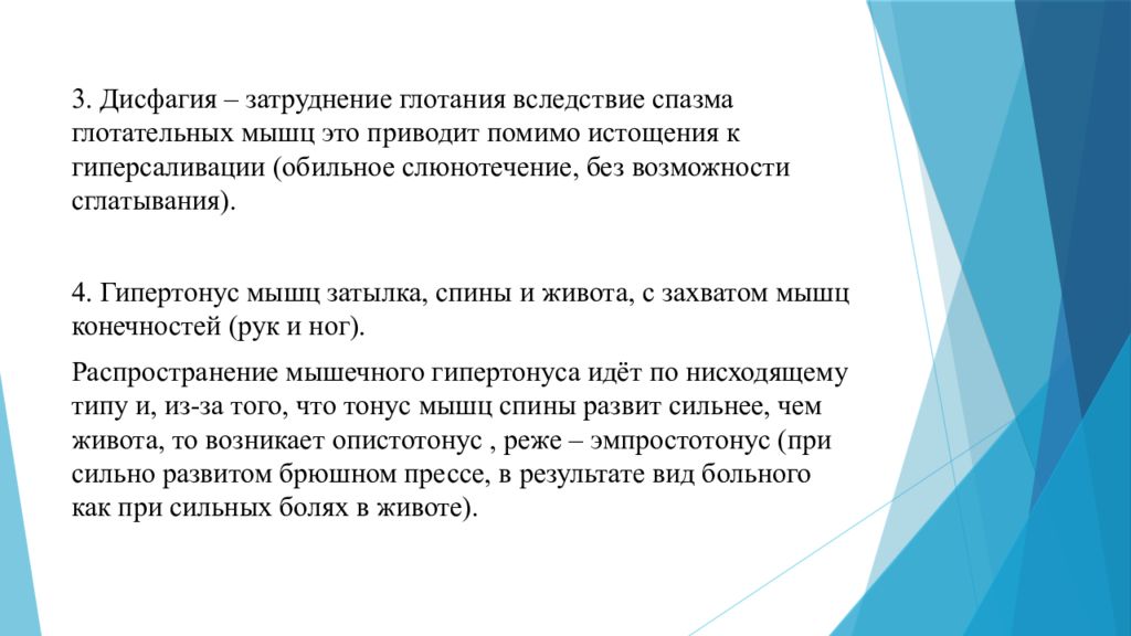 3. Дисфагия – затруднение глотания вследствие спазма глотательных мышц это приводит помимо истощения к гиперсаливации (обильное слюнотечение, без возможности сглатывания ). 4. Гипертонус мышц затылка, спины и живота, с захватом мышц конечностей (рук и ног). Распространение мышечного гипертонуса идёт по нисходящему типу и, из-за того, что тонус мышц спины развит сильнее, чем живота, то возникает опистотонус, реже – эмпростотонус (при сильно развитом брюшном прессе, в результате вид больного как при сильных болях в животе).