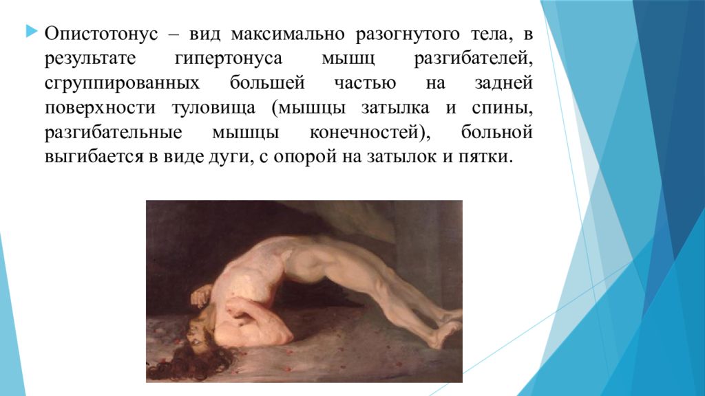 Опистотонус – вид максимально разогнутого тела, в результате гипертонуса мышц разгибателей, сгруппированных большей частью на задней поверхности туловища (мышцы затылка и спины, разгибательные мышцы конечностей), больной выгибается в виде дуги, с опорой на затылок и пятки.