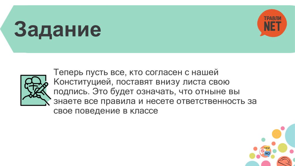 Коституция Я, ( Ф. И.) , знаю все свои права и ограничения и несу за них ответственность. Если я совершу ошибку и случайно обижу кого - то, я прошу напомнить мне о нашем договоре. Если я замечу, что кто - то нарушает правила, я скажу ему « Стоп Буллинг ».