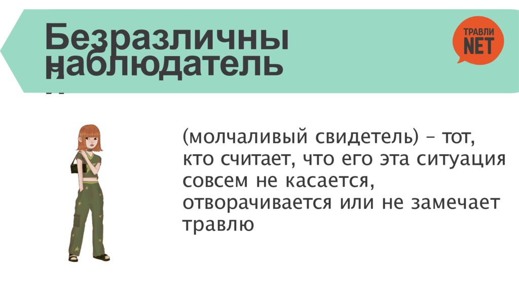 наблюдатель (молчаливый свидетель) – тот, кто считает, что его эта ситуация совсем не касается, отворачивается или не замечает травлю