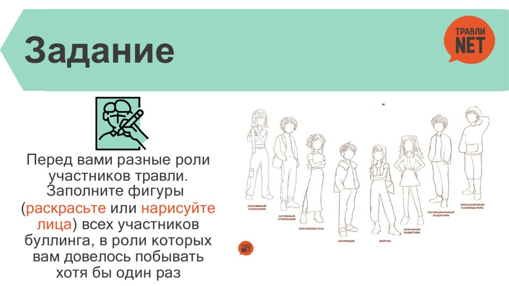 Перед вами разные роли участников травли. Заполните фигуры ( раскрасьте или нарисуйте лица ) всех участников буллинга, в роли которых вам довелось побывать хотя бы один раз