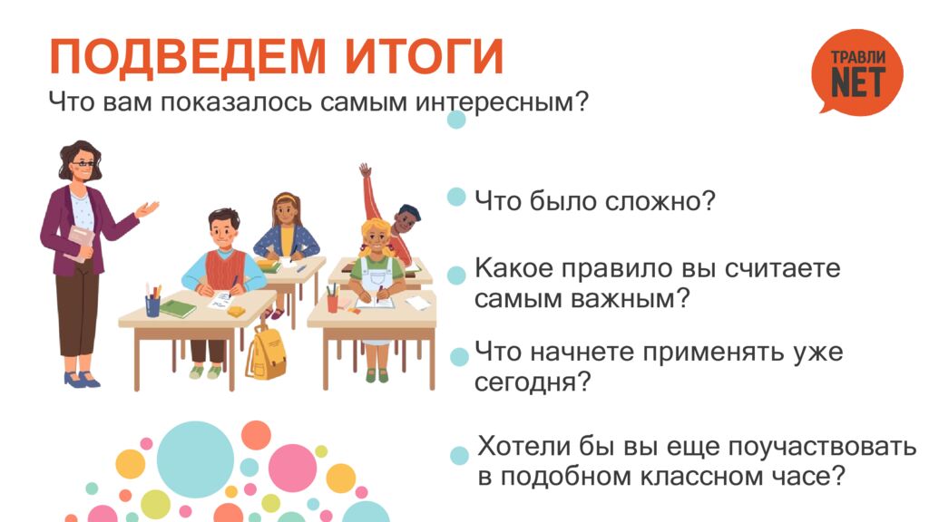 Что было сложно? Какое правило вы считаете самым важным? Что начнете применять уже сегодня? Хотели бы вы еще поучаствовать в подобном классном часе? ПОДВЕДЕМ ИТОГИ Что вам показалось самым интересным?