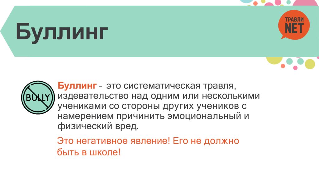Буллинг – это систематическая травля, издевательство над одним или несколькими учениками со стороны других учеников с намерением причинить эмоциональный и физический вред. Это негативное явление! Его не должно быть в школе!