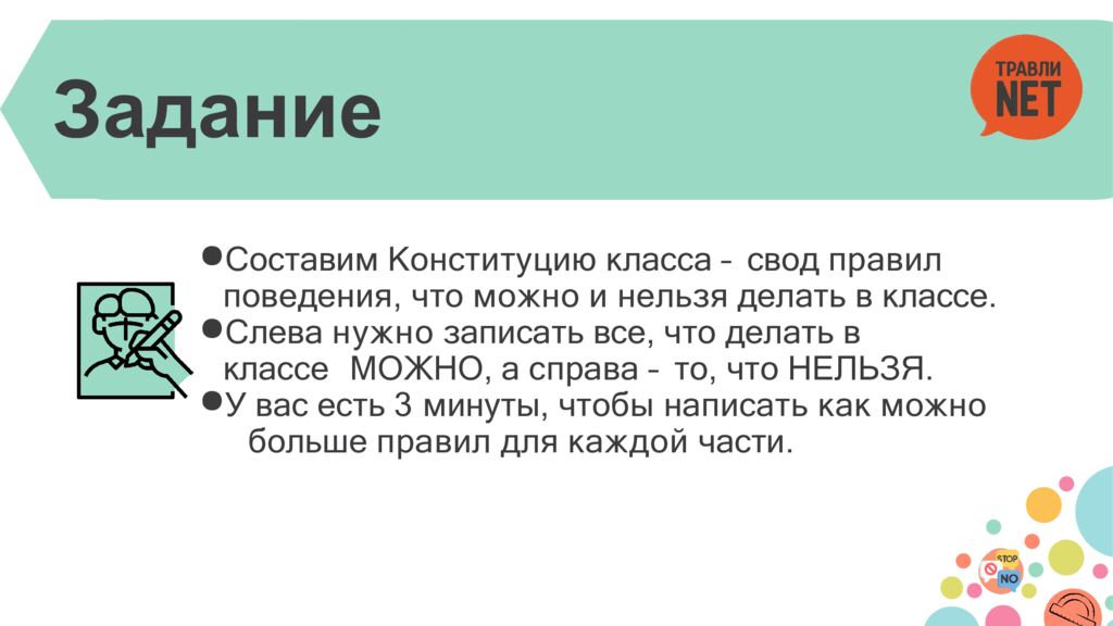 Составим Конституцию класса – свод правил поведения, что можно и нельзя делать в классе. Слева нужно записать все, что делать в классе МОЖНО, а справа – то, что НЕЛЬЗЯ. У вас есть 3 минуты, чтобы написать как можно больше правил для каждой части.