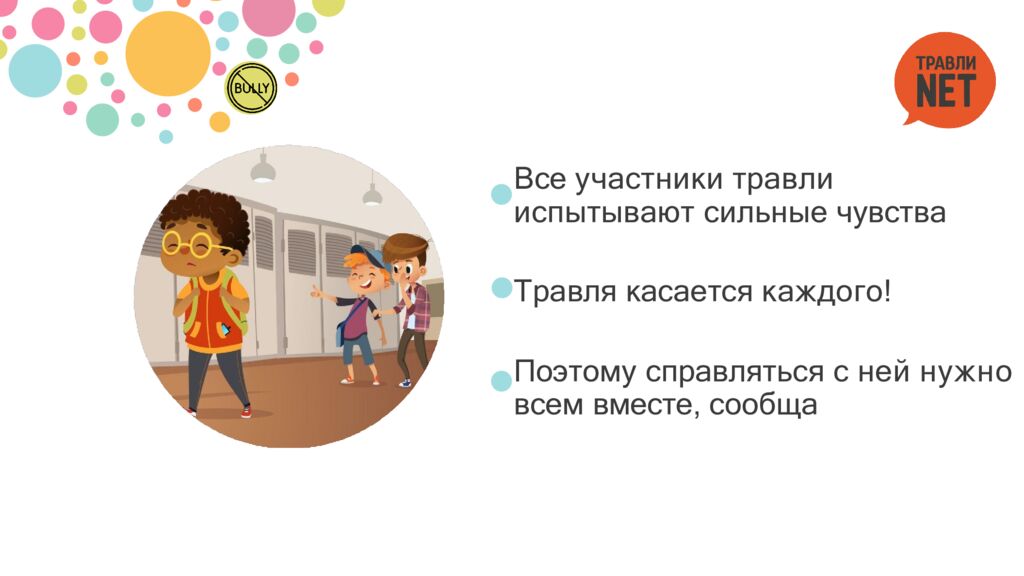 Все участники травли испытывают сильные чувства Травля касается каждого! Поэтому справляться с ней нужно всем вместе, сообща
