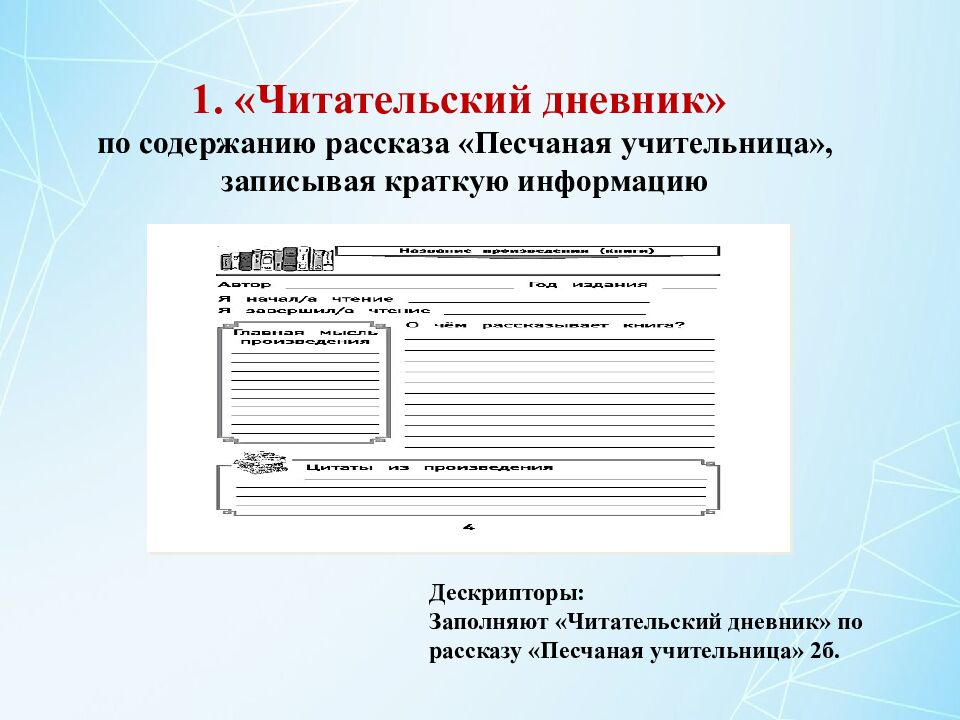 1. «Читательский дневник» по содержанию рассказа «Песчаная учительница», записывая краткую информацию Дескрипторы: Заполняют «Читательский дневник» по рассказу «Песчаная учительница» 2б.