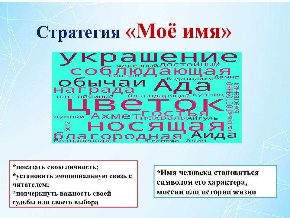 Стратегия «Моё имя» *показать свою личность; *установить эмоциональную связь с читателем; *подчеркнуть важность своей судьбы или своего выбора * Имя человека становиться символом его характера, миссии или истории жизни