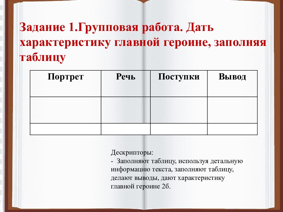 Задание 1.Групповая работа. Дать характеристику главной героине, заполняя таблицу Портрет Речь Поступки Вывод Дескрипторы: - Заполняют таблицу, используя детальную информацию текста, заполняют таблицу, делают выводы, дают характеристику главной героине 2б.